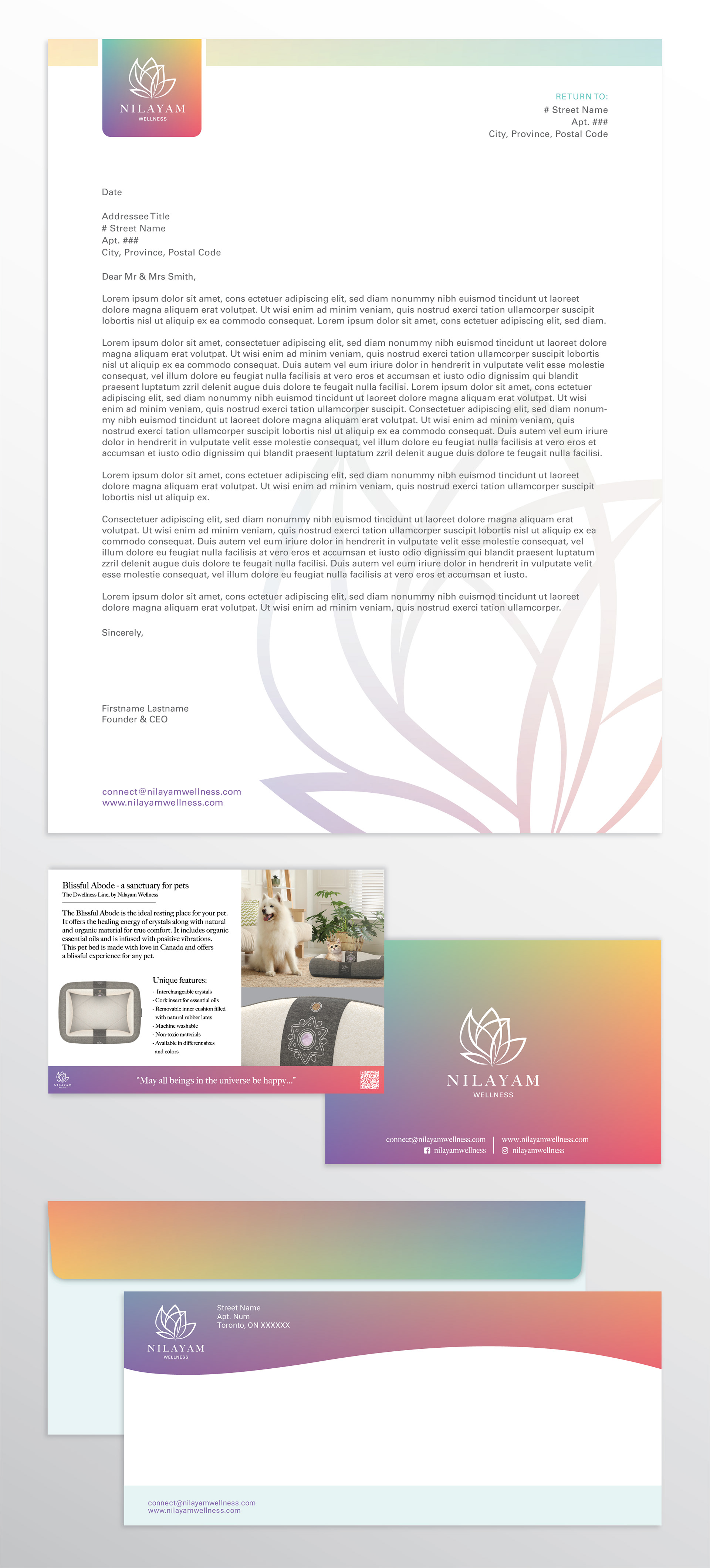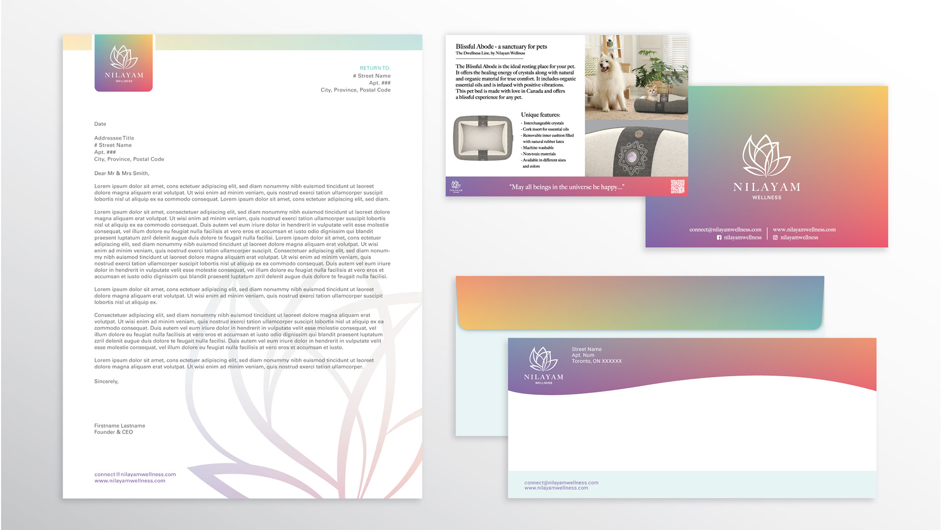 Business stationery designed for Nilayam Wellness and their flagship pet bed product, to go along with their already existing logo & branding.